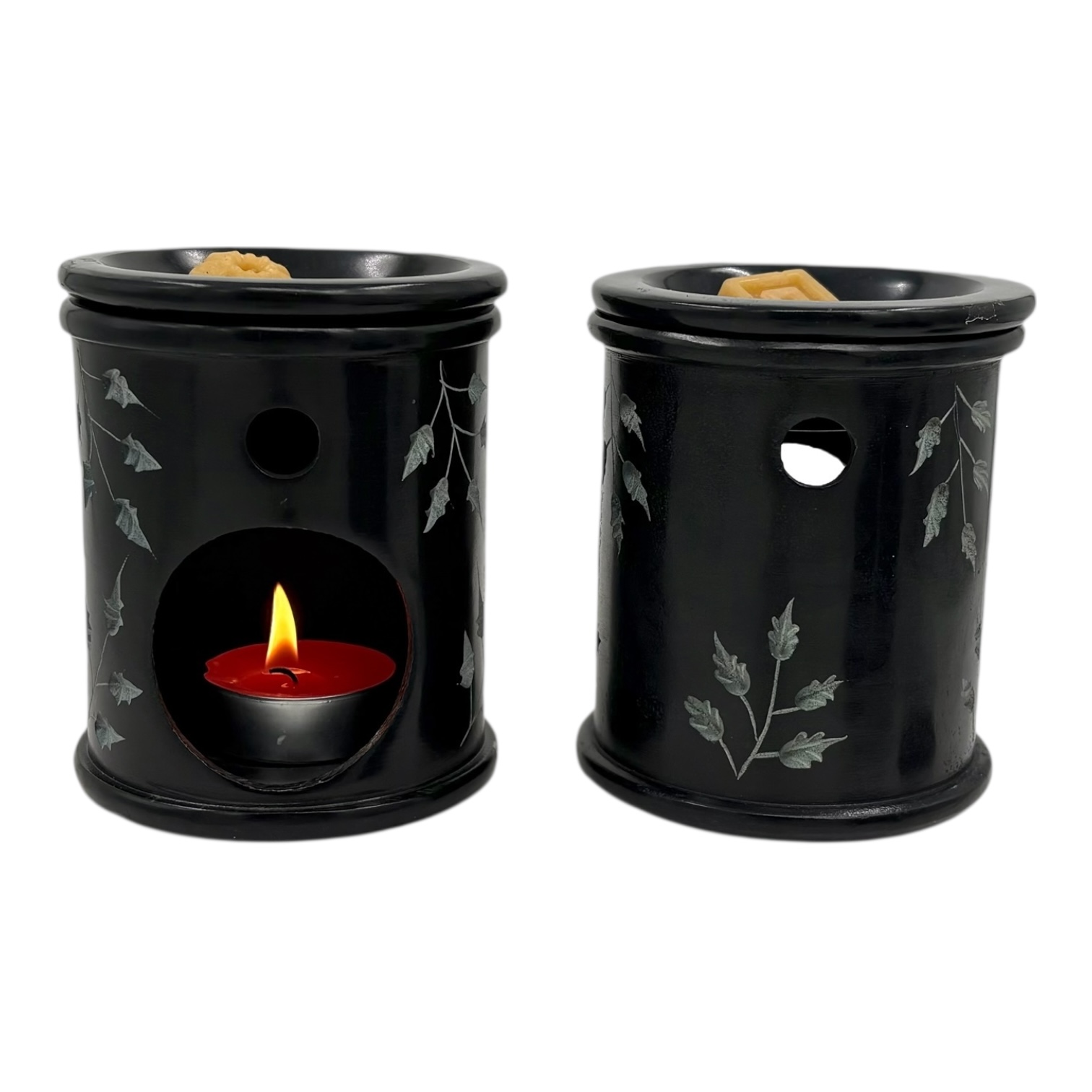 Aromalamp speksteen zwart, gekerfde klein blaadjes