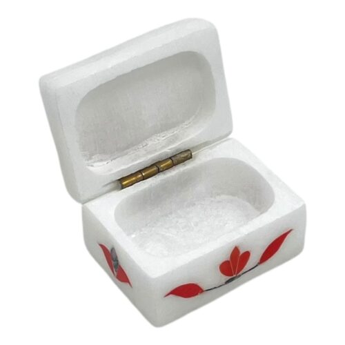 Handgemaakt doosje van albast. Bijvoorbeeld voor het bewaren van sieraden of juist om een sieraad in cadeau te geven. Het doosjes is ingelegd met parelmoer.