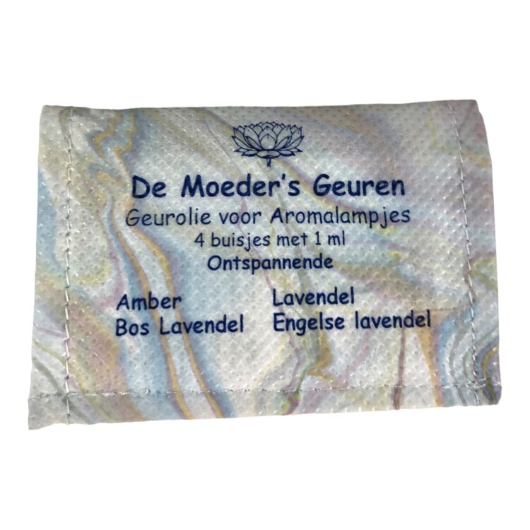 Een probeersetje met 4 flesjes van 1 ml geurolie, te gebruiken in aromalampjes; de 4 glazen mini flesjes zijn verpakt in een handgemaakt, gemarmerd hoesje (een geurbeschrijving is bijgevoegd).