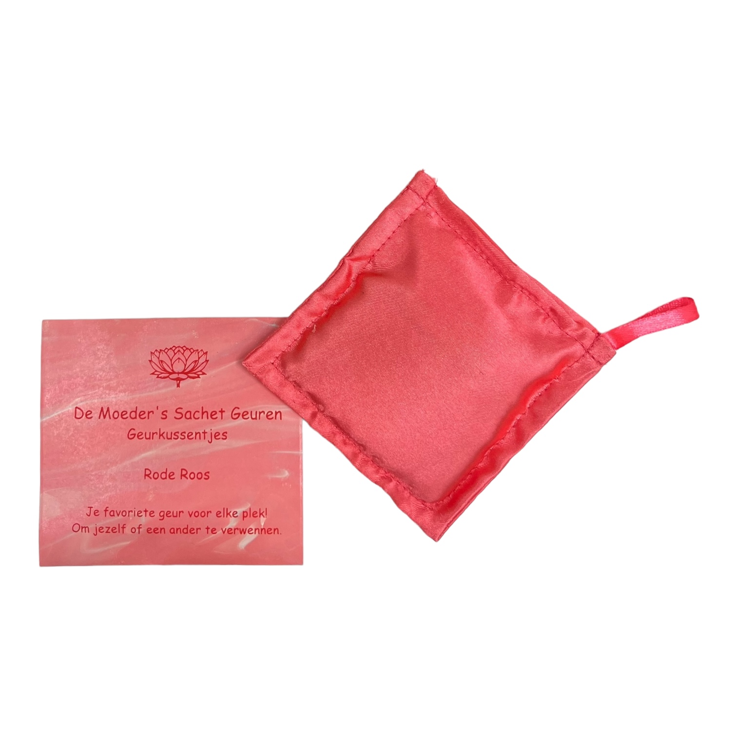 De inhoud van de zakjes bestaat uit wit sandelhoutpoeder waar de Moeder’s Geuren Rode Roos geurolie aan is toegevoegd. Dit geurfestijn zit in een katoenen binnenzakje en is dichtgestikt in een mooi katoenen buitenzakje.