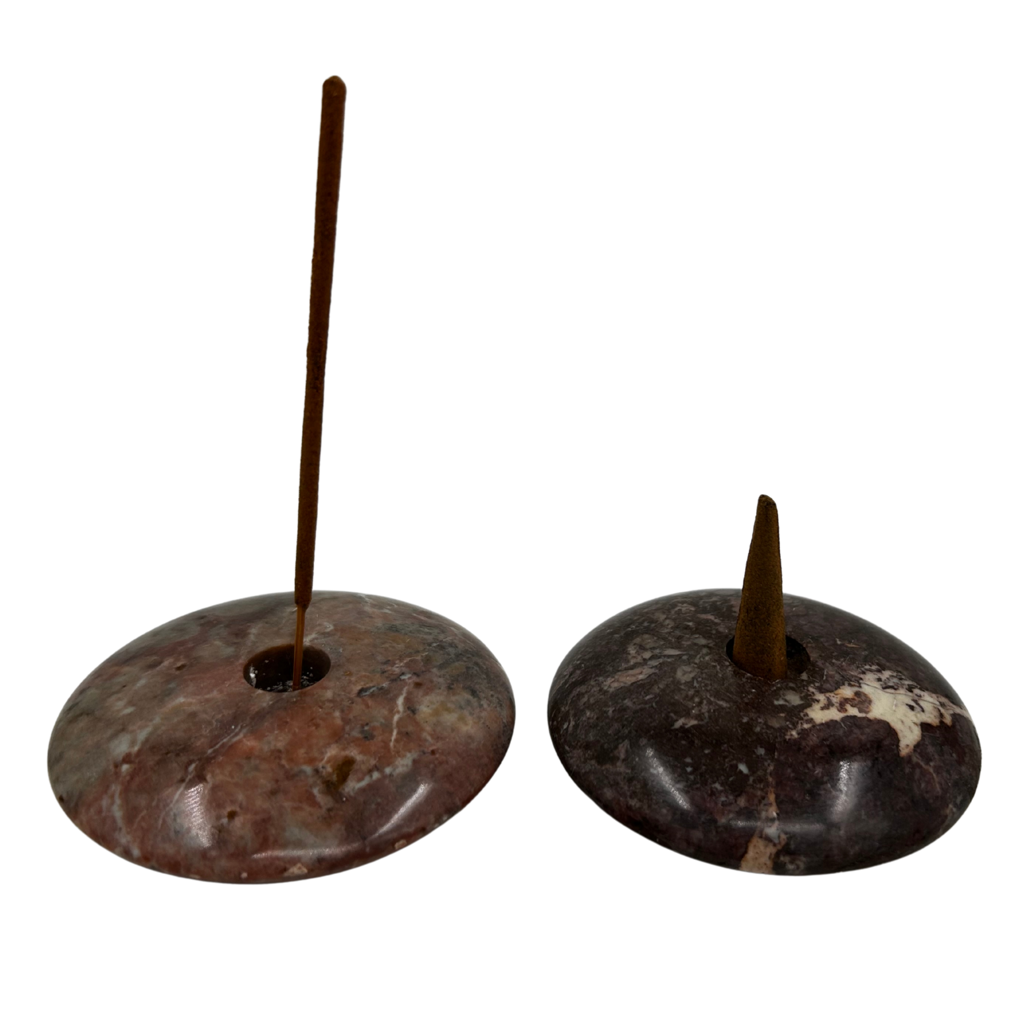 Handgemaakte, glad gepolijste, spekstenen wierookhouder : geschikt voor kegeltjes en voor stokjes.
